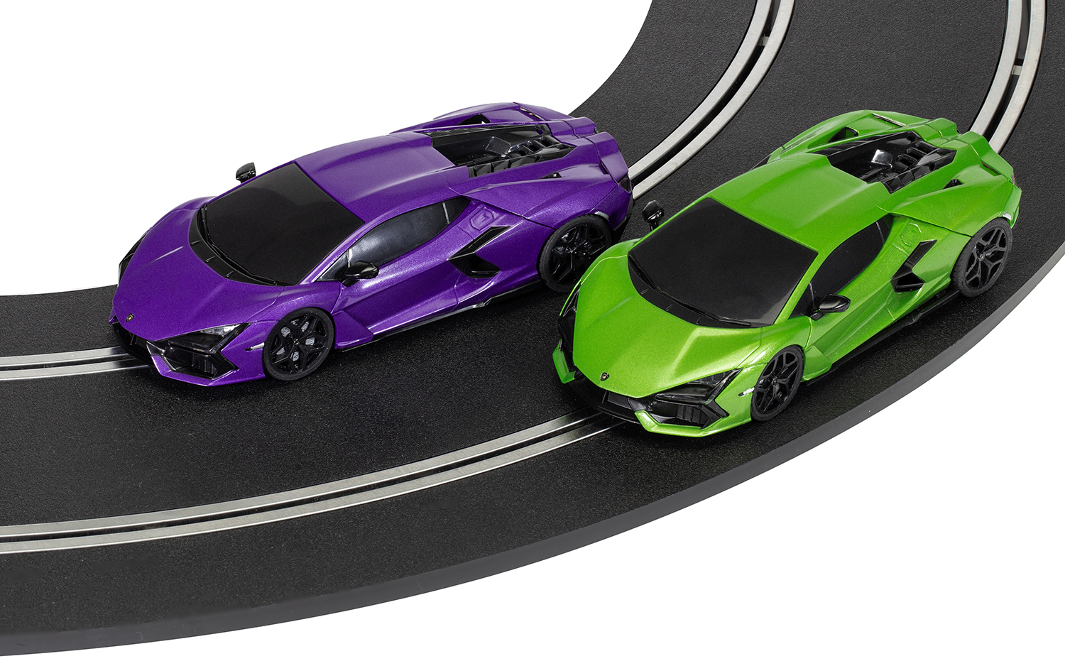 Will you choose the green Scalextric Lamborghini Revuelto or the purple one as your 1:32 scale signature slot car? You might not hit the original’s top speed of 217.5mph, but you’ll still be enthralled by the pace on these realistic slot cars.