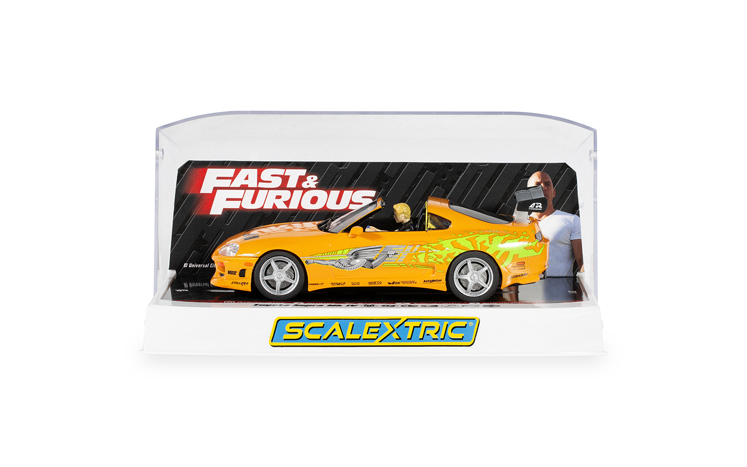 Brian O’Conner’s iconic Toyota Supra is finally available in Scalextric slot car form. Perhaps the most instantly recognisable car from The Fast and the Furious, maybe even movie history, this bold orange ‘ten-second car’ is the one that marked Brian as a street-racing contender, helping him earn respect from Dom and his peers.