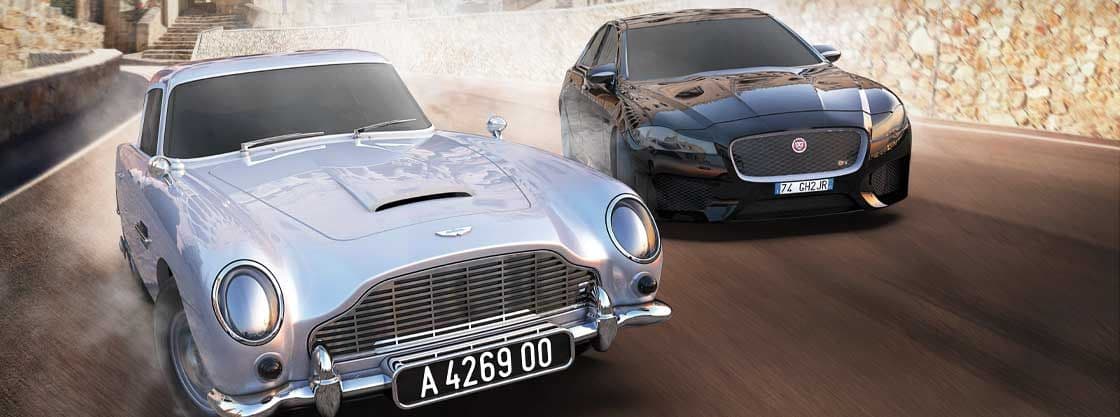Aston Martin, the Aston Martin Wings Logo and the model names "Vantage", "DBS", "DB5" and "DB10" are trademarks owned licensed or used by Aston Martin Lagonda Limited. All rights reserved. Jaguar and the leaper device are trademarks owned and licensed by Jaguar Land Rover Limited. James Bond materials © 1962-2020 Danjaq and MGM. Related James Bond Trademarks are Trademarks of Danjaq, LLC. All Rights Reserved.
